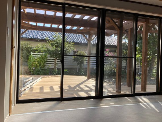 中からも、外のデッキとパーゴラが見えます。