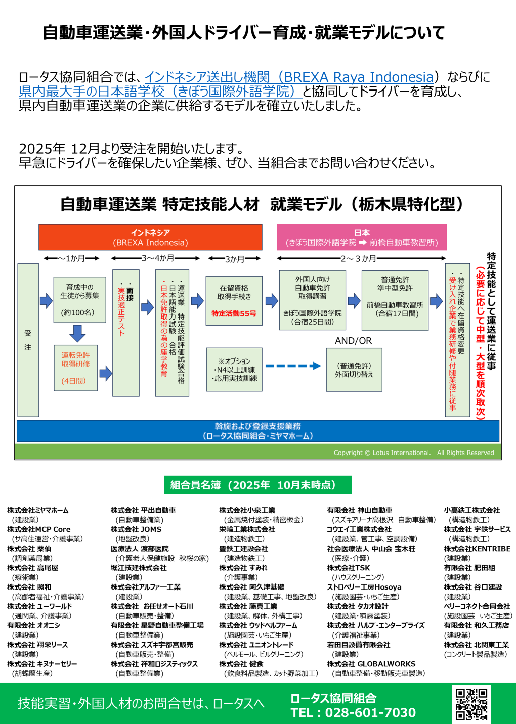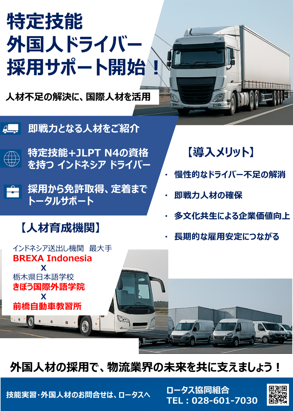 ロータス協同組合・ミヤマホーム国際事業部では、インドネシア送出し機関(BREXA Indonesia)ならびに県内最大手の日本語学校(きぼう国際外語学院)と連携して外国人ドライバーを育成し、栃木県内の自動車運送業の企業に供給するモデルを確立いたしました。